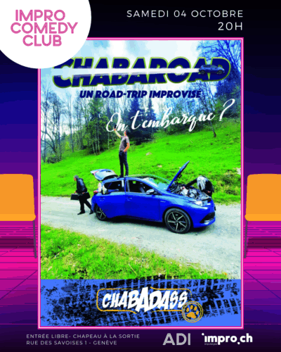 Le Chabaroad, un road movie improvisé dont vous allez créer les personnages. Ensuite, place à l’aventure ! Et si vous embarquiez en covoiturage avec des inconnus pour un voyage qui part en vrille ? Créez, ensemble, les covoitureurs et leurs secrets et suivez les aventures totalement improvisées de ce road movie vivant