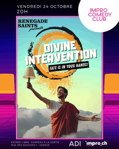 Divine Intervention is the comedy show where you, the audience, are the fates of destiny. An improvised story will play out on stage before your eyes, however you, equipped with your special powers, will get to intervene in destiny and give distinct directions that will forever alter the story on the stage.